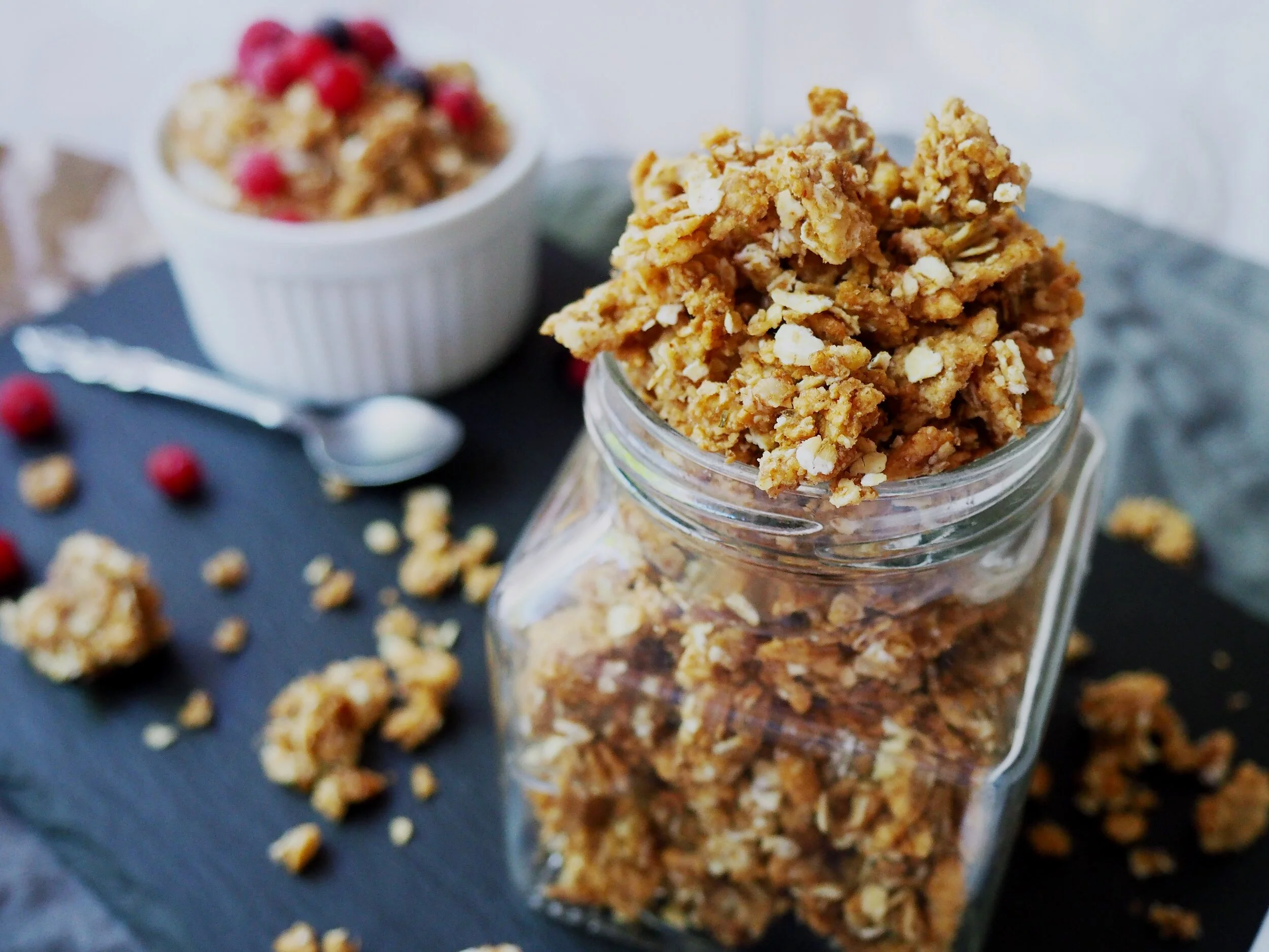 Mix all ingredients together in a bowl so chunks are created of the almond butter and date pure.