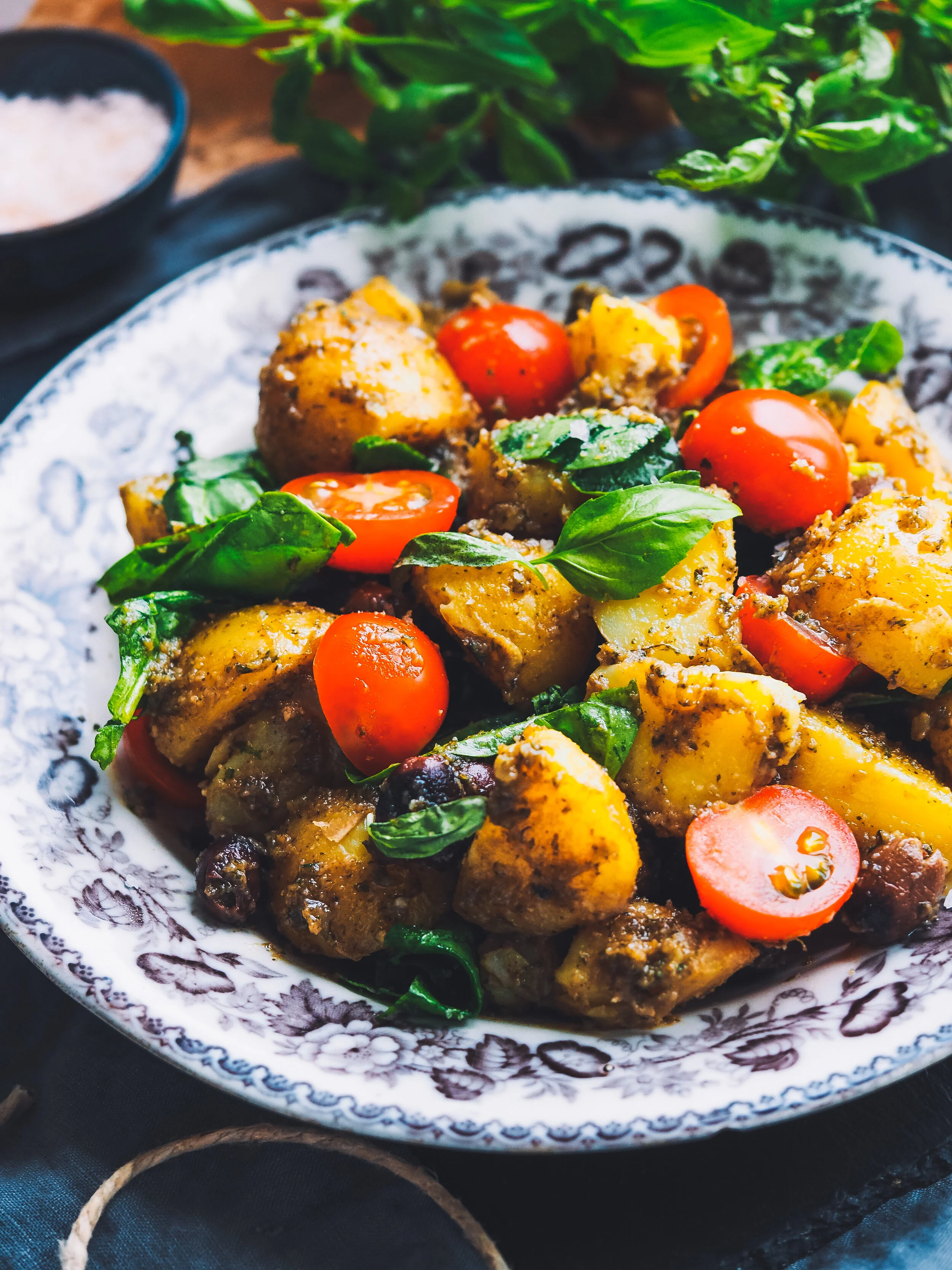 Vegan Potato Salad with Pesto, Cherry Tomatoes and Olives